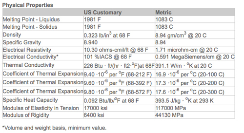 Note: This is a high conductivity copper which has, in the annealed condition a minimum concuctivity of 100% IACS except for Alloy C10100 which has a minimum conductivity of 101% IACS.